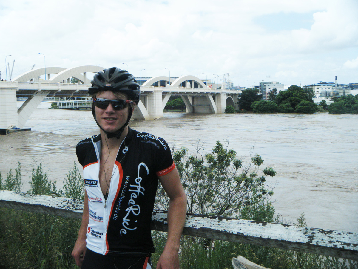 | Das Bild zeigt Josh vor dem Brisbane River |